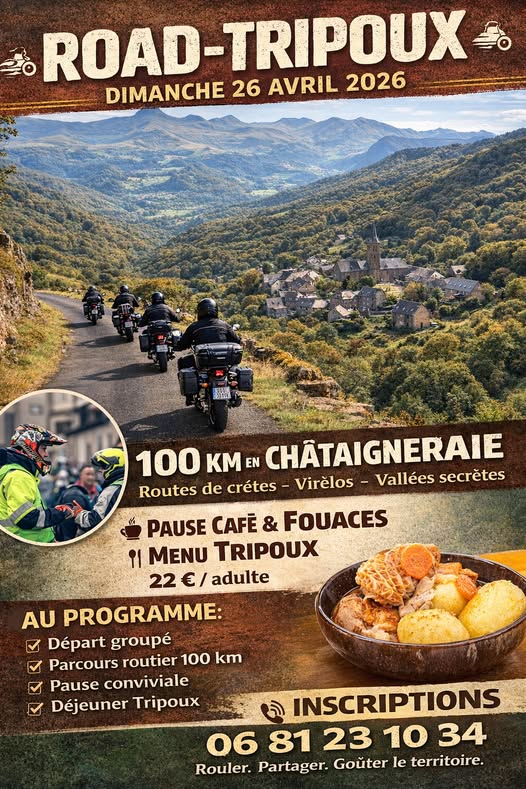 Embarquez pour le Road Tripoux ! Partez à la découverte de la Châtaigneraie avec un parcours routier de 100 km autour des routes des crètes, virèlos et les vallées secrètes. Profitez ensuite d’une pause conviviale autour d’un café et de fouaces puis d’un déjeuner tripoux !