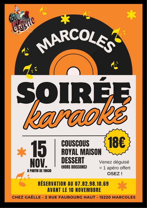 Repas couscous royal maison et dessert, 18€ hors boissons. Si vous venez déguisé, un apéritif est offert