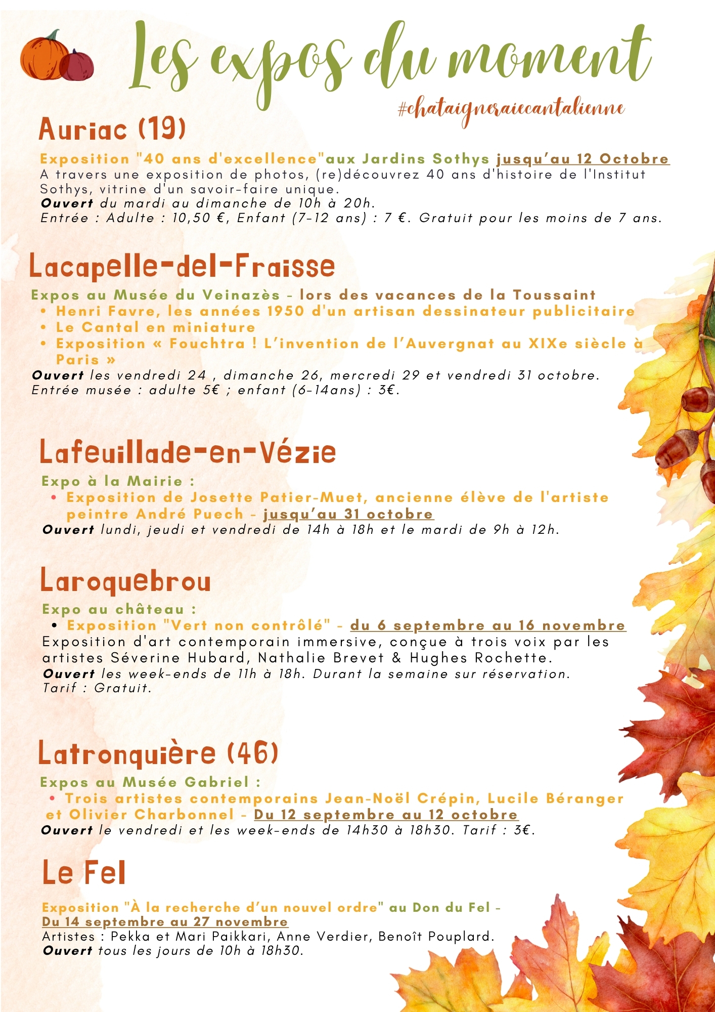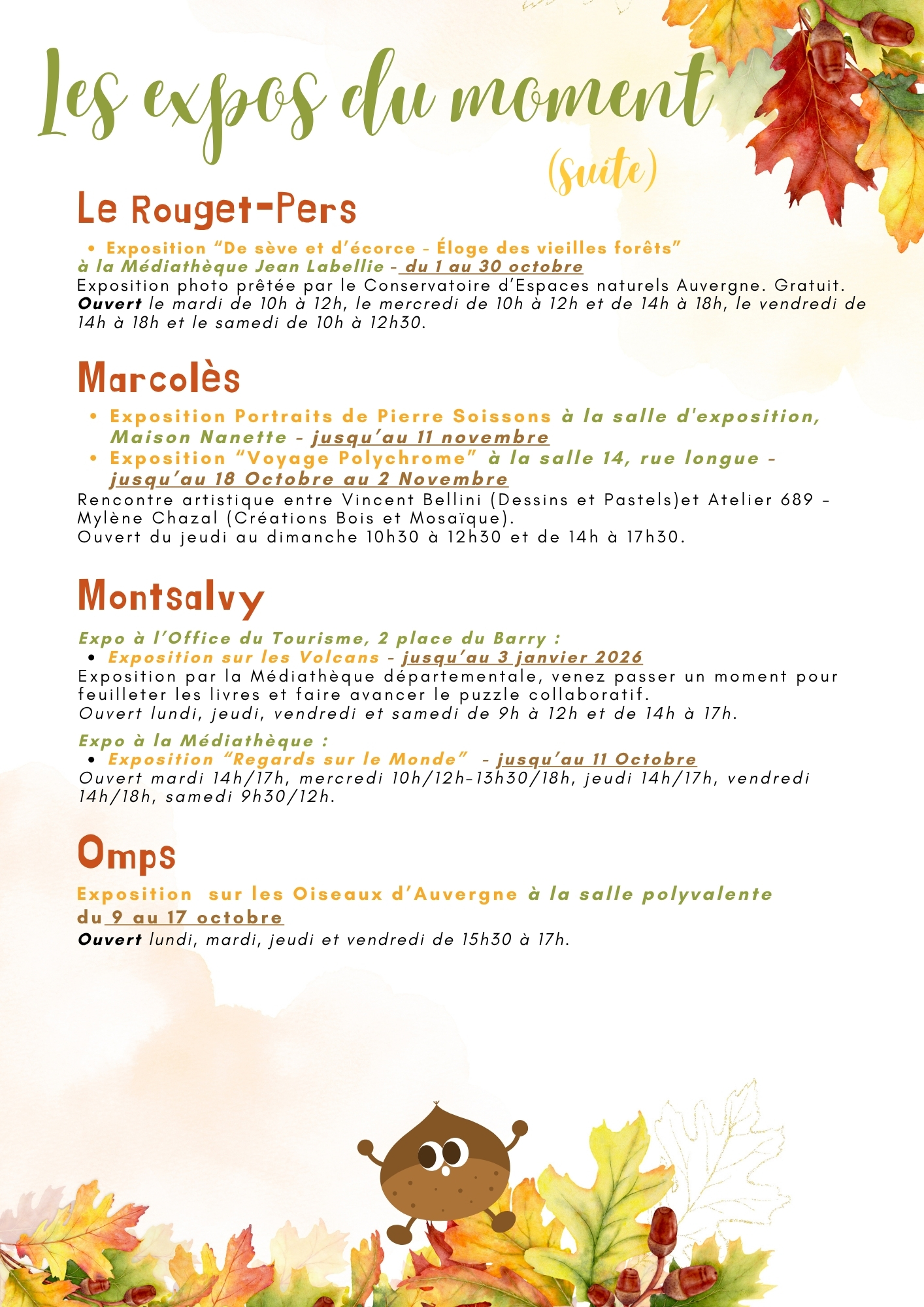 • 21 juillet 2025Bonjour, pour toute demande concernant cette expo, vous pouvez contacter l’association Culture et Patrimoine au 04 71 43 54 46 ou par mail à culturepatrimoine15@gmail.com. A bientôt !