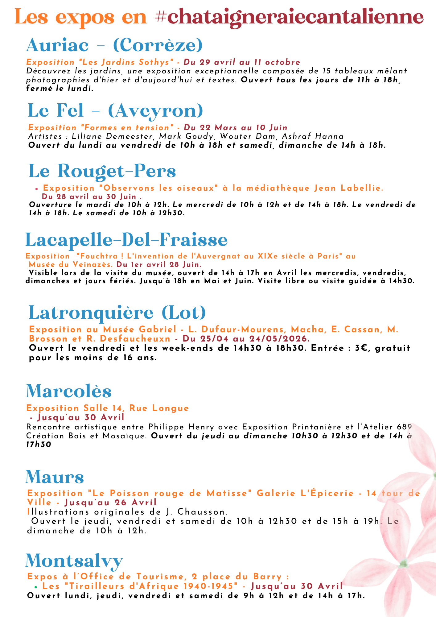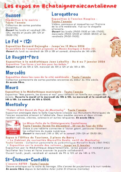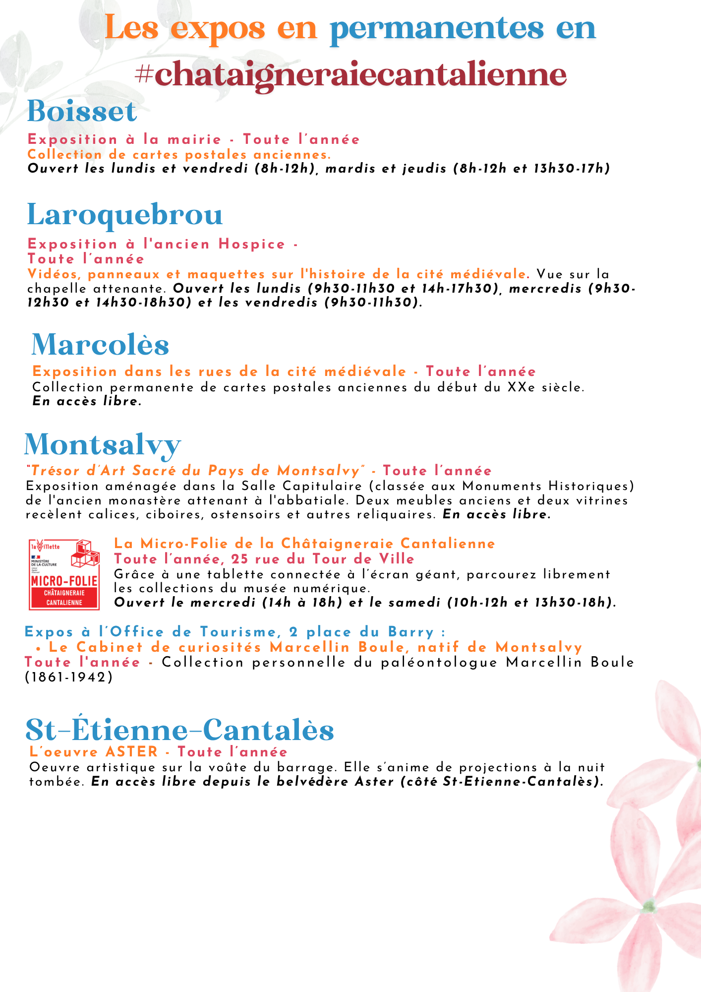 • 21 juillet 2025Bonjour, pour toute demande concernant cette expo, vous pouvez contacter l’association Culture et Patrimoine au 04 71 43 54 46 ou par mail Ă culturepatrimoine15@gmail.com. A bientĂ´t !