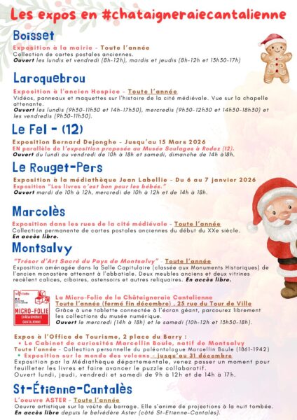 • 21 juillet 2025Bonjour, pour toute demande concernant cette expo, vous pouvez contacter l’association Culture et Patrimoine au 04 71 43 54 46 ou par mail Ă culturepatrimoine15@gmail.com. A bientĂ´t !