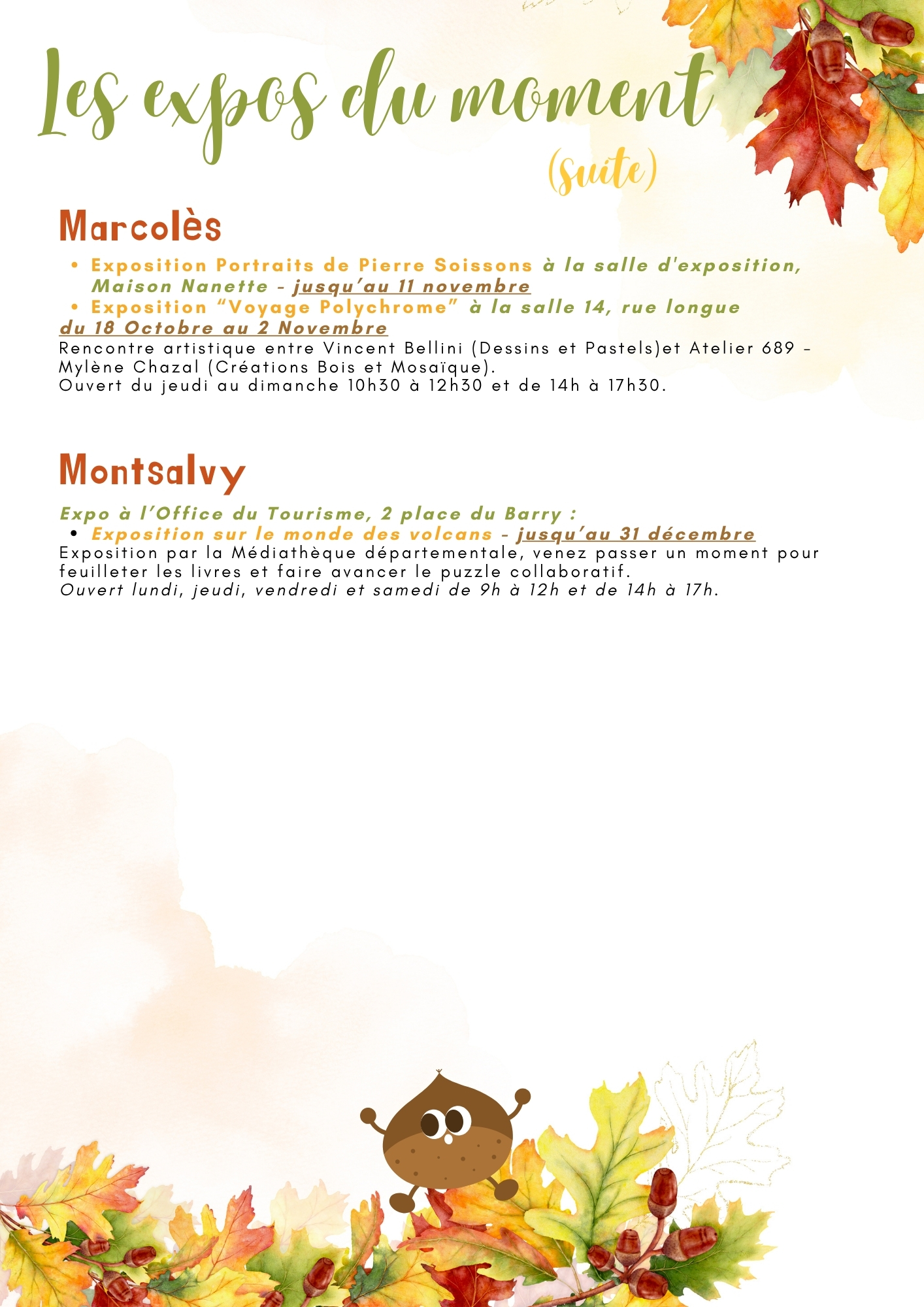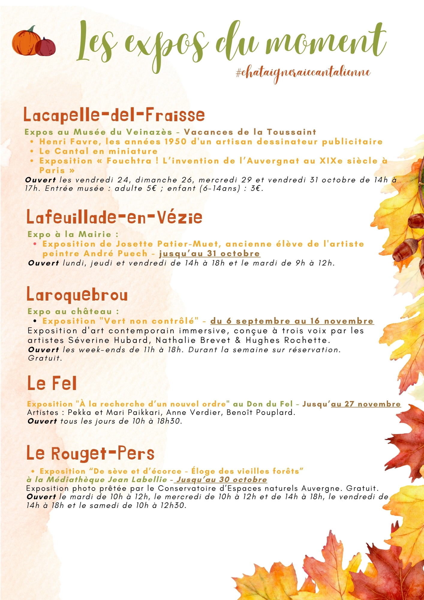 • 21 juillet 2025Bonjour, pour toute demande concernant cette expo, vous pouvez contacter l’association Culture et Patrimoine au 04 71 43 54 46 ou par mail à culturepatrimoine15@gmail.com. A bientôt !