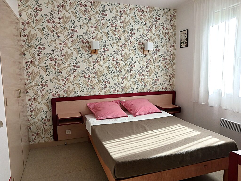 Gîte 37.5 m2 + covered terrace, 1 bedroom with double bed, 1 bedroom with 2 single beds, living room with fitted kitchen, bathroom, WC and entrance.