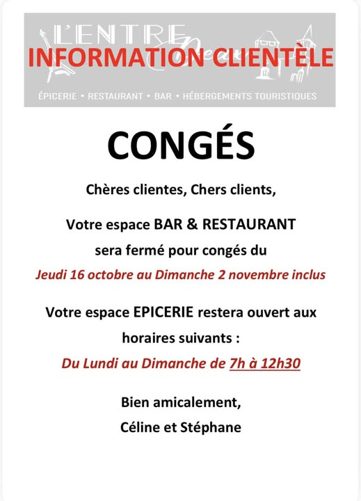 Fermetures exceptionnelles les 23/10/2025, 24/10/2025, 25/10/2025, 26/10/2025, 27/10/2025, 28/10/2025, 29/10/2025, 30/10/2025, 31/10/2025, 01/11/2025 et 02/11/2025.