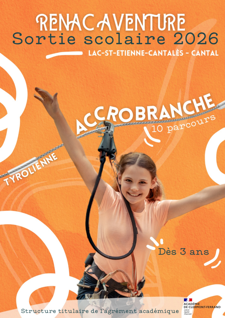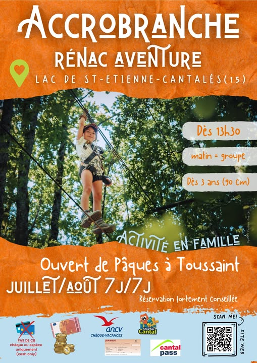 À 20 minutes d’Aurillac, face à la plage aménagée et surveillée de Rénac, au bord du lac de Saint-Étienne-Cantalès, dans la forêt ombragée de chênes sur la presqu’île, 10 parcours d’arbre en arbre enfant / adulte (140 activités) à partir de 90 cm.